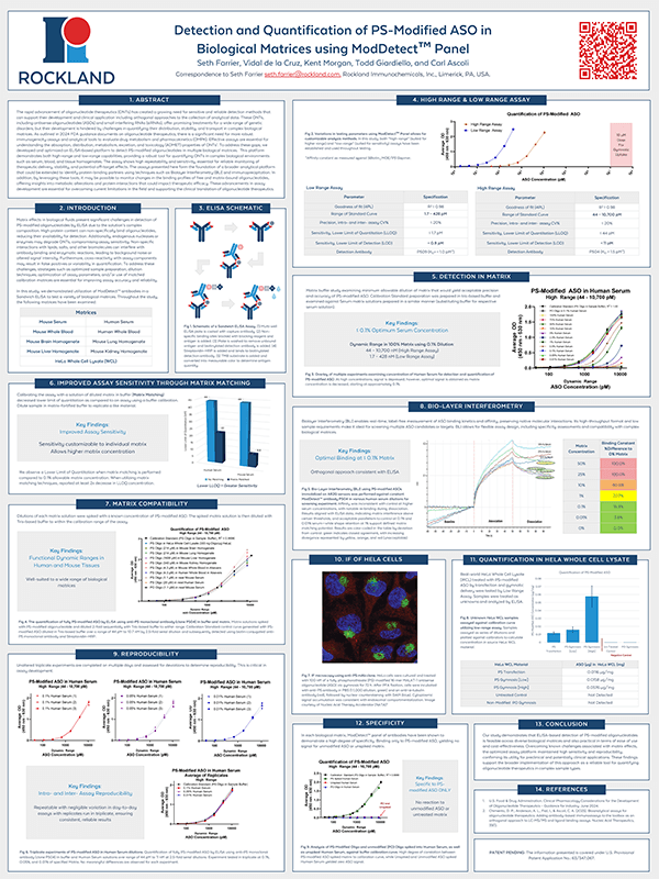 After introducing the core capabilities of ModDetect, this poster showcases the next step: applying the platform in quantitative, regulatory-relevant workflows. Here, we present an ELISA-based assay optimized for detecting phosphorothioate (PS)-modified oligonucleotides in complex biological samples, including serum, blood, and tissue homogenates. This sensitive and high-throughput approach addresses key challenges outlined in FDA guidance—enabling robust ADMET and DMPK assessments critical to the clinical advancement of ONTs. With potential extensions into Biolayer Interferometry (BLI) and immunoprecipitation, this work positions ModDetect as a powerful tool for therapeutic monitoring and mechanistic insight.