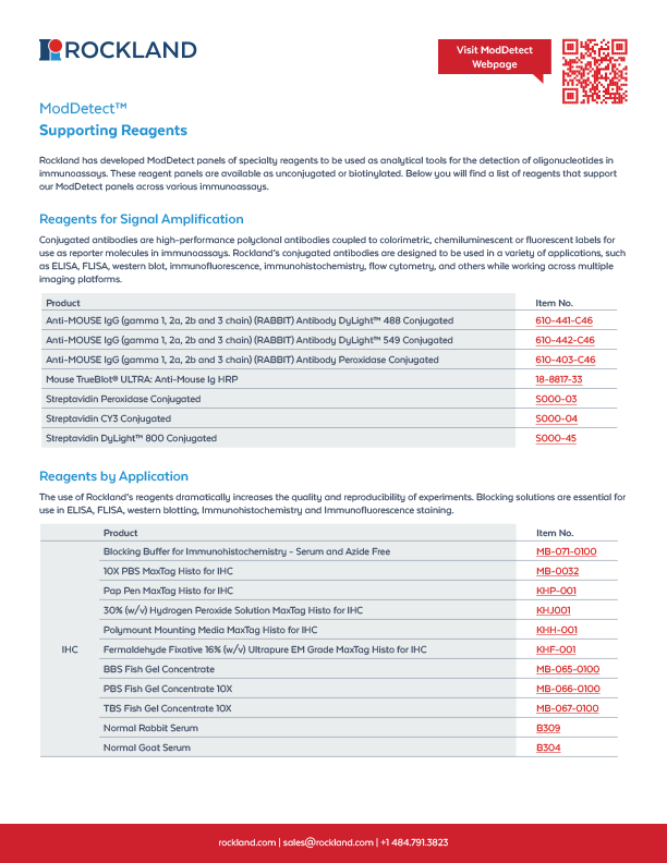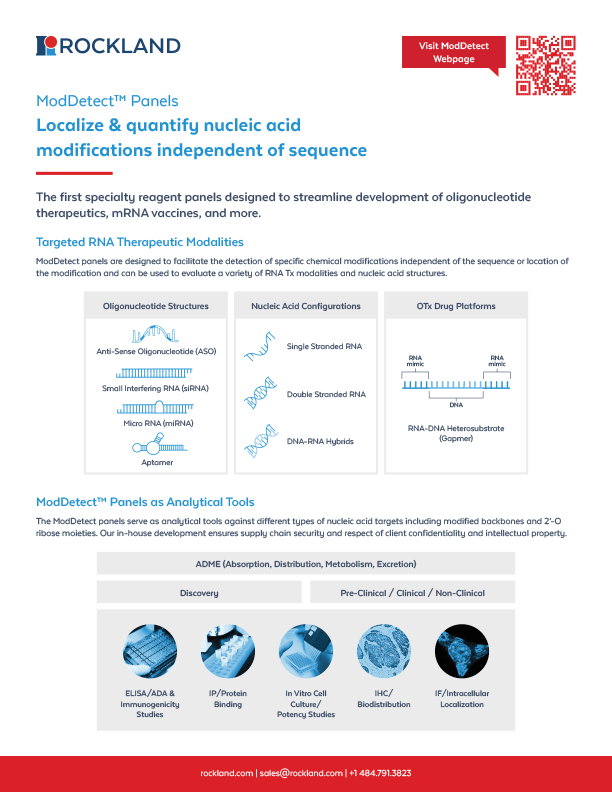 This introductory poster presents ModDetect, Rockland’s platform of validated monoclonal antibodies that recognize key chemical modifications in oligonucleotide therapeutics (ONTs), including phosphorothioate (PS), 2’-O-methoxy-ethyl (MOE), and 2’-O-methyl (OMe). Designed for use across diverse assay types, ModDetect provides an orthogonal alternative to LC-MS/MS and ligand binding assays by enabling direct localization and quantification of ONTs in lysates and biofluids. Explore how this powerful tool supports drug development pipelines by improving analytical confidence in ADMET and regulatory studies.